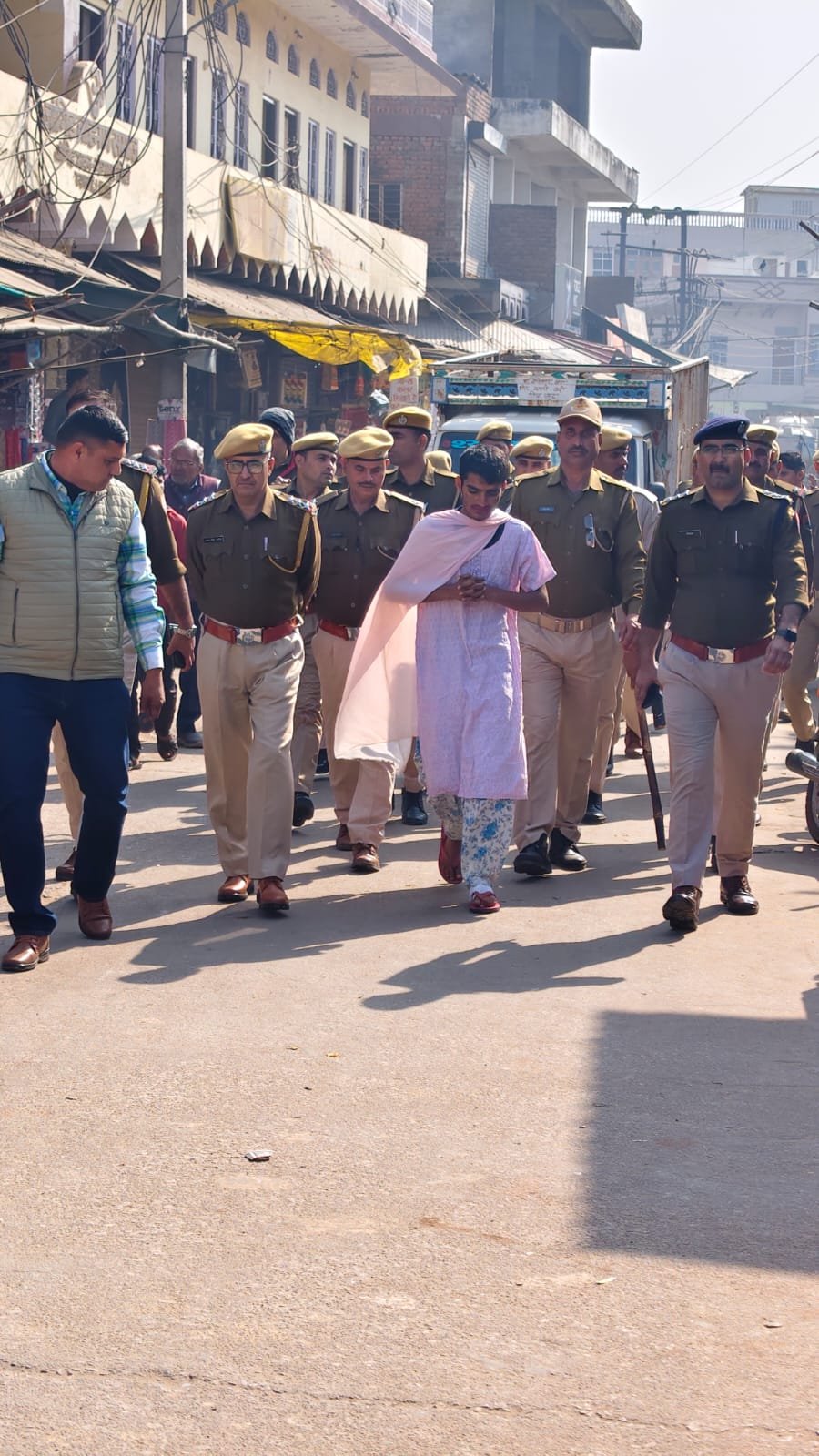 पुलिस उपाधीक्षक गिर्राज मीणा और कोतवाली थानाधिकारी करणसिंह राठौड़ के नेतृत्व में आरोपी का जुलूस कोतवाली थाना, देवी स्टोर चौराहा, खारी बाजार, चौपड़, कैलाश टॉकीज, जामा मस्जिद, फव्वारा चौक, कचहरी रोड होते हुए पुनः कोतवाली थाना तक निकाला गया। जुलूस के दौरान बड़ी संख्या में लोग मौके पर मौजूद रहे।