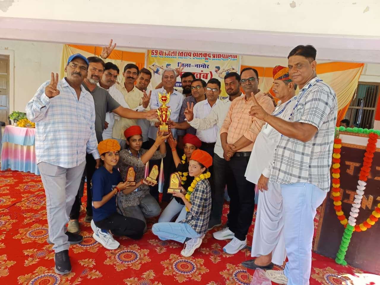 पादूकलां (नागौर)। लांपोलाई राजकीय उच्च माध्यमिक विद्यालय में गुरुवार को 69वीं जिला स्तरीय मलखंब प्रतियोगिता का समापन समारोह बड़े उत्साह और धूमधाम के साथ हुआ। प्रतियोगिता में शानदार प्रदर्शन करने वाले प्रतिभागियों को मोमेंटो, प्रशस्ति पत्र और साफा पहनाकर सम्मानित किया गया। दर्शकों ने बच्चों के करतबों को तालियों और जयकारों से सराहा।
