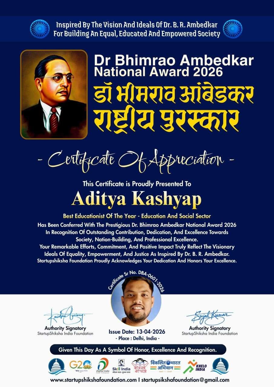 उनियारा: शिक्षा एवं सामाजिक क्षेत्र में उत्कृष्ट कार्य के लिए महर्षि कश्यप स्नातकोत्तर महाविद्यालय दूनी के डिप्टी डायरेक्टर आदित्य कश्यप को “डॉ. भीमराव अंबेडकर राष्ट्रीय पुरस्कार 2026” से सम्मानित किया गया है।