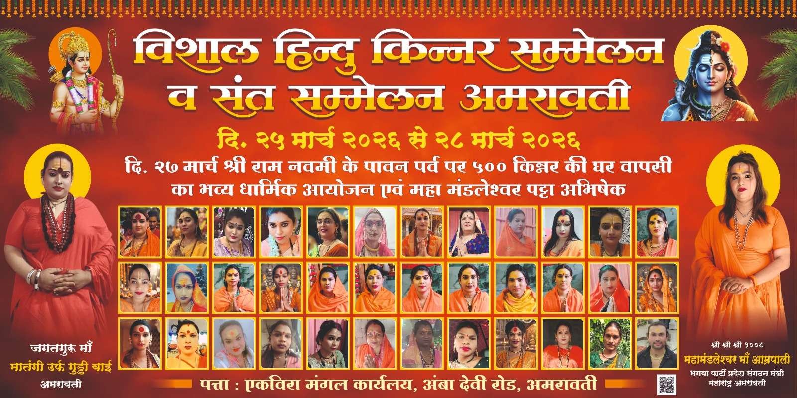 अमरावती, महाराष्ट्र। अमरावती के माँ अंबा की पवित्र धरती पर हिंदू किन्नर सम्मेलन एवं संत सम्मेलन अमरावती में 25 से 28 मार्च तक आयोजित किया जाएगा। कार्यक्रम की जानकारी देते हुए जगतगुरु मां मातंगी उर्फ गुड्डी बाई ने बताया कि कार्यक्रम में पूज्य संत जगतगुरु काजल ठाकुर के पावन सानिध्य में संत पूज्य संत जगतगुरु शंकराचार्य स्वामी हिमांगी सखी , स्वामी अजय दास संस्थापक किन्नर अखाड़ा, और जगद्गुरु किन्नर संजना मां के मार्गदर्शन में जगतगुरु गुड्डी मां के द्वारा 500 केंद्र के घर वापसी होगी।