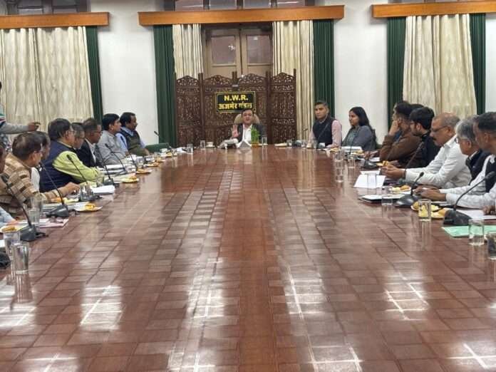 अजमेर। अजमेर मंडल के 15 स्टेशनों पर अमृत स्टेशन योजना के अंतर्गत चल रहे विकास कार्यों की प्रगति को लेकर मंडल कार्यालय के सभा कक्ष में एक महत्वपूर्ण बैठक आयोजित की गई। बैठक की अध्यक्षता मंडल रेल प्रबंधक राजू भूतड़ा ने की।