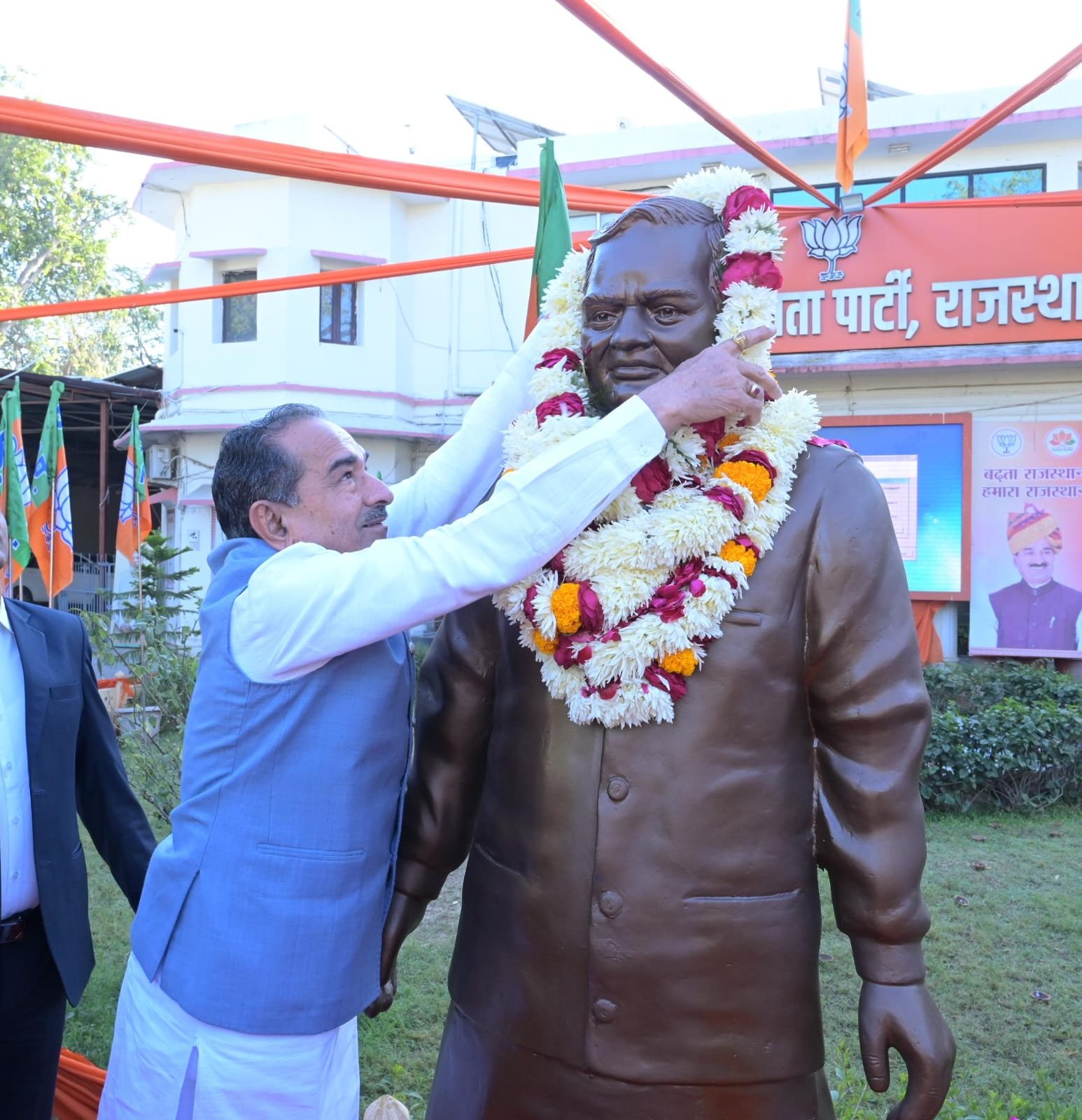 जयपुर | भारत रत्न, पूर्व प्रधानमंत्री अटल बिहारी वाजपेयी की 101वीं जयंती के अवसर पर भारतीय जनता पार्टी के प्रदेश कार्यालय में श्रद्धा, सम्मान और संकल्प के साथ उन्हें स्मरण किया गया। इस अवसर पर भाजपा प्रदेश अध्यक्ष मदन राठौड़ ने अटल बिहारी वाजपेयी के चित्र पर पुष्पांजलि अर्पित कर उन्हें नमन किया और उनके जीवन को राष्ट्रसेवा की अमूल्य विरासत बताया।