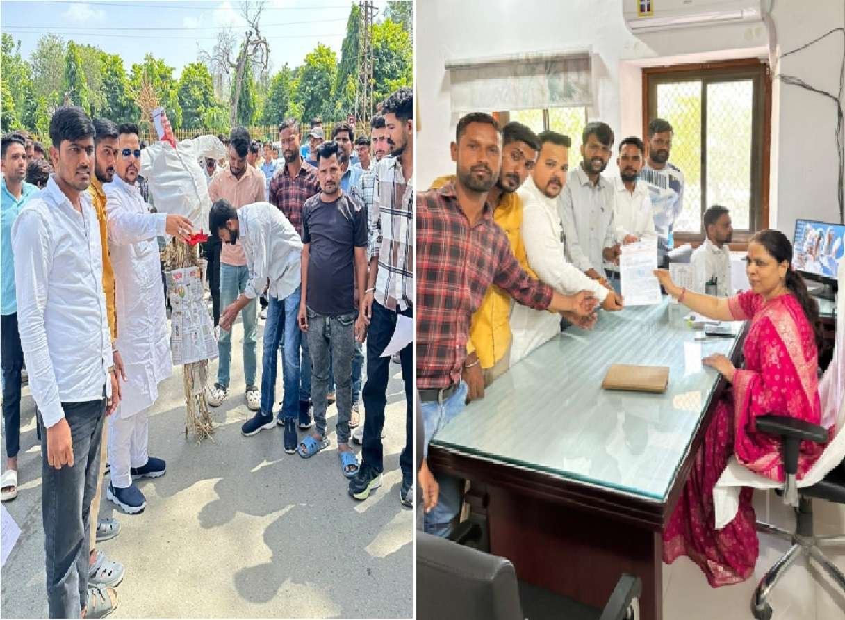 भीलवाड़ा (पंकज पोरवाल) – एनएसयूआई जिलाध्यक्ष भावेश कुमार पुरोहित के नेतृत्व में शुक्रवार को एनएसयूआई कार्यकर्ताओं ने जिला कलेक्टर कार्यालय के सामने विरोध प्रदर्शन किया और मुख्यमंत्री भजनलाल शर्मा का पुतला फूंका। इसके बाद कलेक्ट्रेट में ज्ञापन सौंपा गया, जिसमें राजस्थान विश्वविद्यालय के परिसर में आयोजित समारोह में शस्त्र पूजन और राजनीतिक गतिविधियों पर आपत्ति जताई गई।