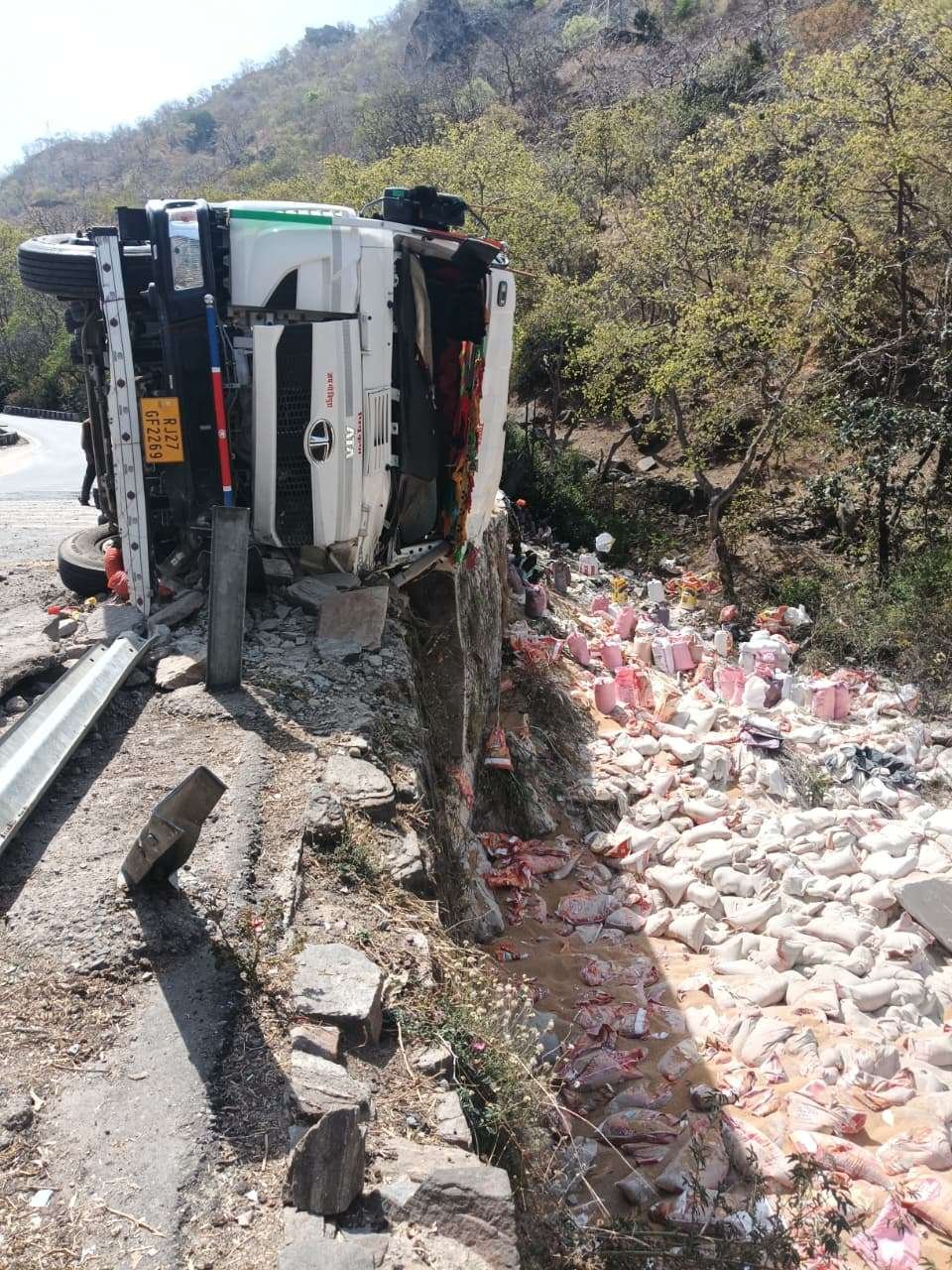 देसूरी घाट में खाद्य सामग्री से भरा ट्रेलर पलटा, खाई में बिखरा सामान