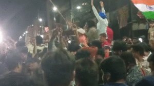सड़क पर बच्चे टीम इंडिया के झंडे लहराते दिखे, वहीं कई लोग गाड़ियों पर बैठकर भारत माता की जय और “विजेता टीम इंडिया” के नारे लगाते नज़र आए। पूरे इलाके में त्योहार जैसा माहौल रहा।