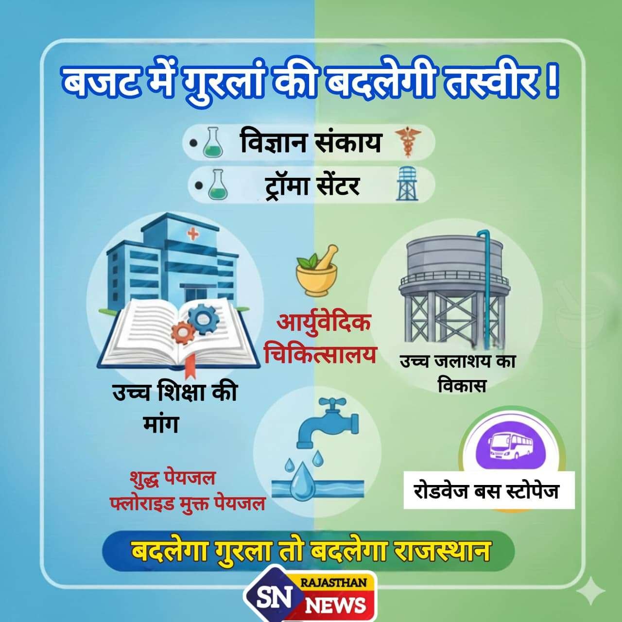 गुरला (भीलवाड़ा)। राजस्थान सरकार द्वारा आगामी फरवरी माह में प्रस्तुत किए जाने वाले वार्षिक बजट को लेकर भीलवाड़ा जिले के गुरला क्षेत्र में उम्मीदें चरम पर हैं। वर्षों से लंबित बुनियादी सुविधाओं को लेकर स्थानीय जनता, सामाजिक संगठनों एवं जनप्रतिनिधियों ने सरकार से मांग की है कि इस बार बजट में स्वास्थ्य, शिक्षा, पेयजल एवं परिवहन से जुड़ी जनहितैषी योजनाओं को प्राथमिकता दी जाए, ताकि “बदलेगी गुरला की तस्वीर” केवल नारा न रह जाए।