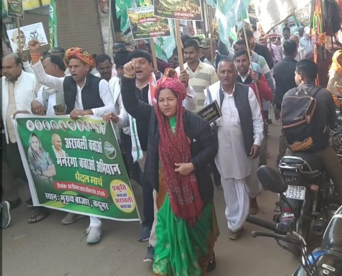 कठूमर (अलवर) | कठूमर में शनिवार को अरावली बचाओ जन-जागरण अभियान के तहत पैदल मार्च निकाला गया। यह मार्च लक्ष्मणगढ़ बस स्टैंड स्थित जाट धर्मशाला से शुरू होकर मुख्य बाजार से होते हुए निकला। मार्च के माध्यम से अरावली पर्वत श्रृंखला से जुड़े कथित षड्यंत्र के खिलाफ आवाज उठाई गई, जिसे प्रकृति और आने वाली पीढ़ियों के भविष्य पर सीधा हमला बताया गया।