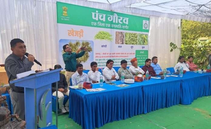 नागौर (प्रदीप कुमार डागा)। राज्य सरकार की फ्लैगशिप योजना पंच गौरव की जानकारी आमजन तक पहुंचाने तथा एक जिला एक वनस्पति योजना के अंतर्गत खेजड़ी प्रजाति के संरक्षण और प्रचार-प्रसार के उद्देश्य से वन विभाग द्वारा नागौर मण्डल परिसर में एक दिवसीय किसान जागरूकता एवं तकनीकी जानकारी कार्यशाला आयोजित की गई।
