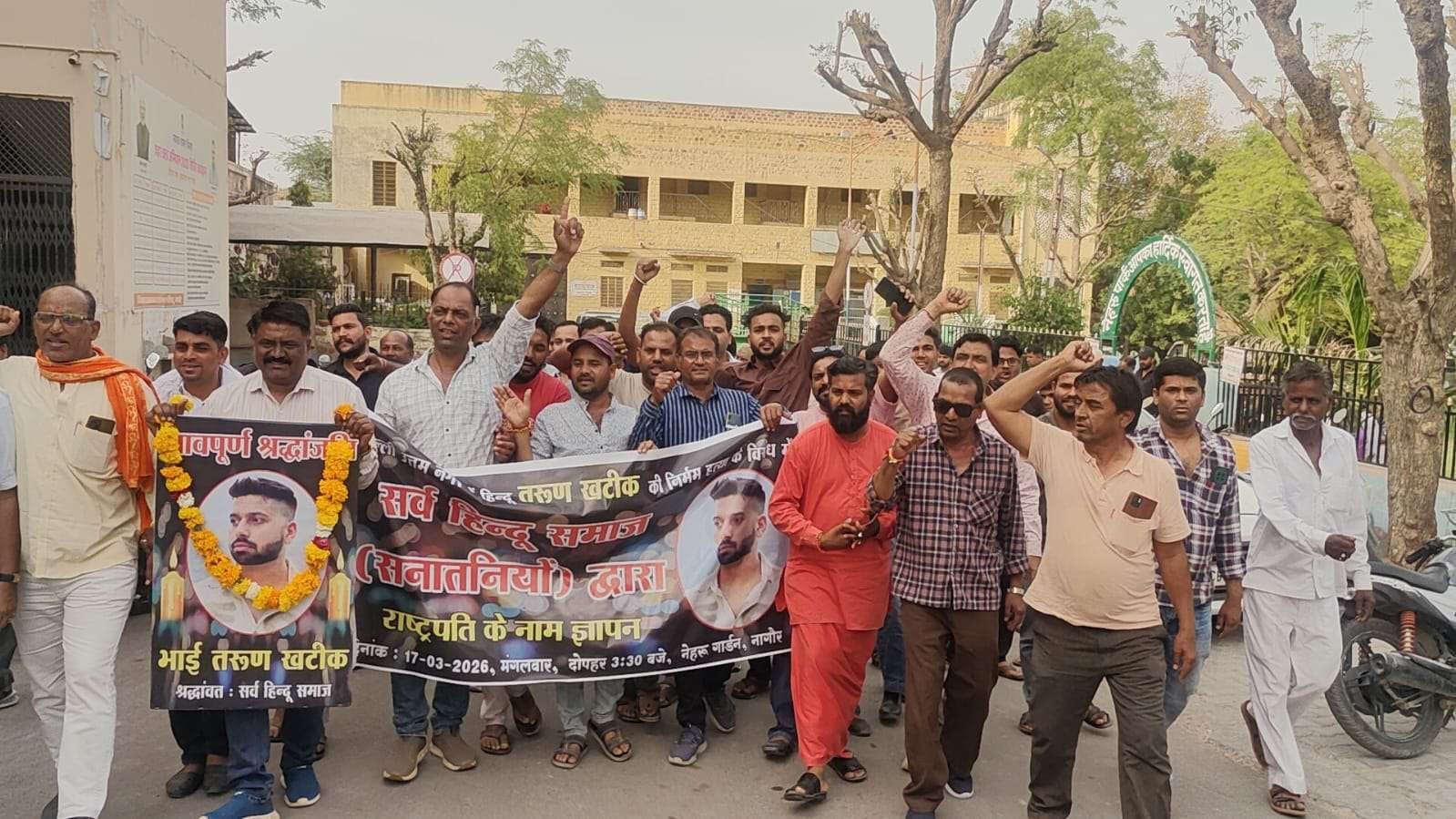 नागौर (प्रदीप कुमार डागा)। नागौर में सर्व हिंदू समाज की ओर से दिल्ली में होली के दिन युवक तरुण खटीक की हत्या के विरोध में नेहरू पार्क में श्रद्धांजलि सभा का आयोजन किया गया। सभा के बाद लोगों ने प्रदर्शन करते हुए दोषियों के खिलाफ कड़ी कार्रवाई और पीड़ित परिवार को न्याय दिलाने की मांग उठाई।