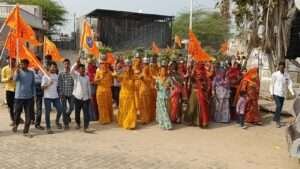 आयोजन समिति एवं नथावडी मंडल के तत्वावधान में शोभायात्रा चारभुजा मंदिर नथावडी से प्रारंभ होकर सदर बाजार, प्रमुख मार्गों और विभिन्न मोहल्लों से होती हुई करणी माता मंदिर नथावडी रोड पहुंची। महिलाओं ने सिर पर मंगल कलश धारण कर मंगल गीत गाए, जबकि युवाओं ने हाथों में भगवा ध्वज लेकर धार्मिक उद्घोष किए।
