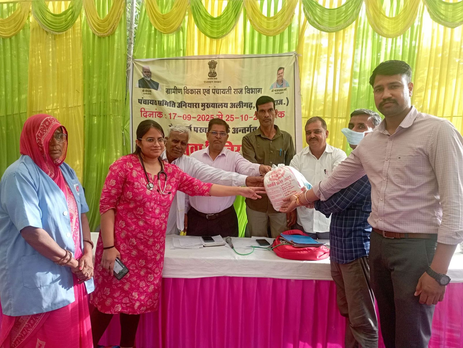 शिविर में डॉ. सुमन मीना (प्राथमिक स्वास्थ्य केंद्र प्रभारी) के नेतृत्व में चिकित्सा विभाग की टीम ने टीबी मरीजों को निक्षय पोषण योजना के तहत पोषण किट वितरित किए और स्वास्थ्य संबंधी जानकारी दी।