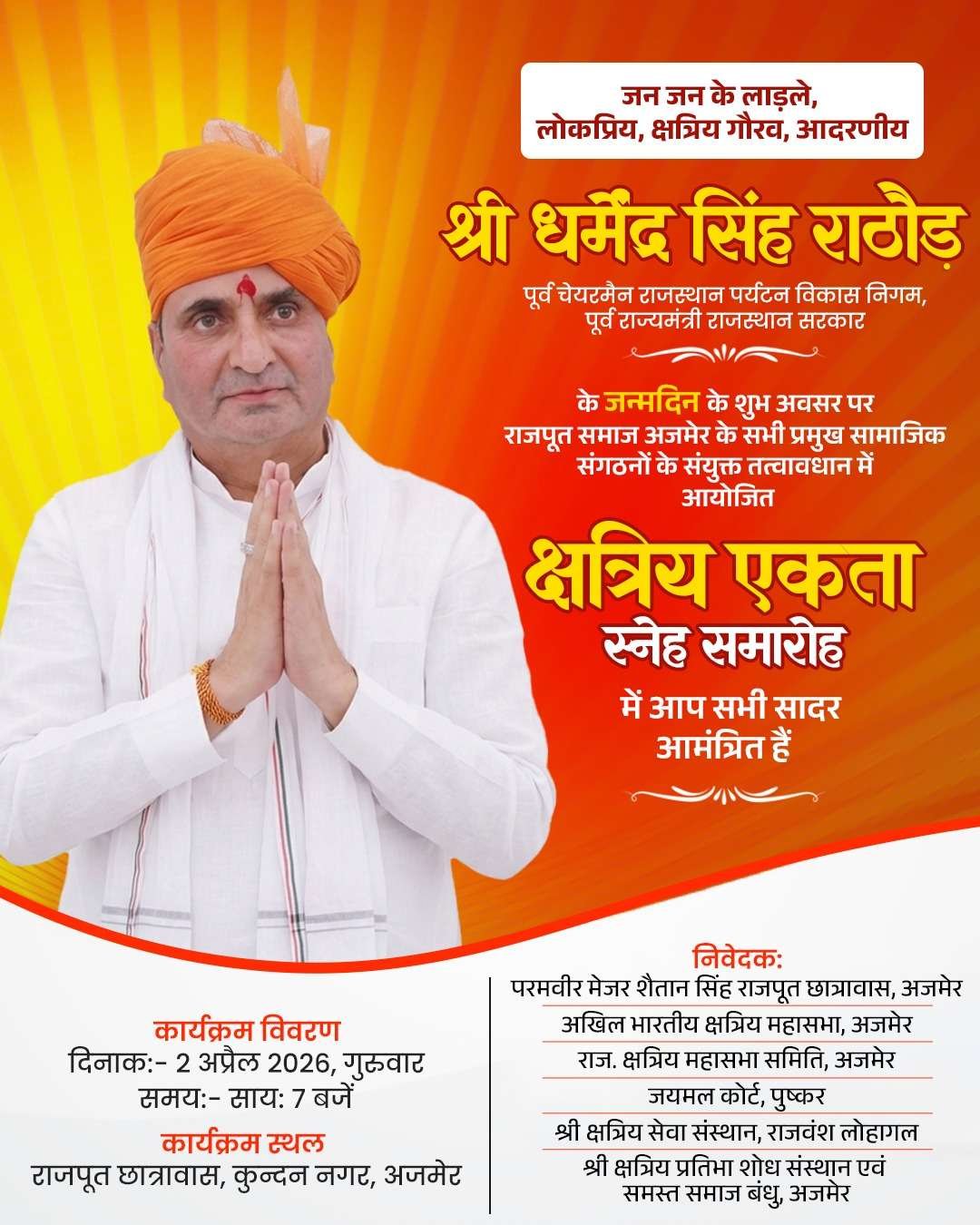 अजमेर/पुष्कर। राजस्थान पर्यटन विकास निगम (RTDC) के पूर्व अध्यक्ष एवं वरिष्ठ कांग्रेस नेता धर्मेंद्र राठौड़ का जन्मदिवस 2 अप्रैल 2026, गुरुवार को “सेवा दिवस” के रूप में मनाया जाएगा। इस अवसर पर अजमेर सहित प्रदेशभर में समर्थकों द्वारा सामाजिक, धार्मिक और जनसेवा से जुड़े कार्यक्रम आयोजित किए जाएंगे।
