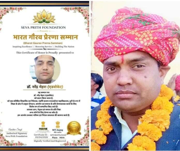 डॉ. नरेंद्र मेहरा एडवोकेट को ‘भारत गौरव प्रेरणा सम्मान नेशनल अवार्ड’