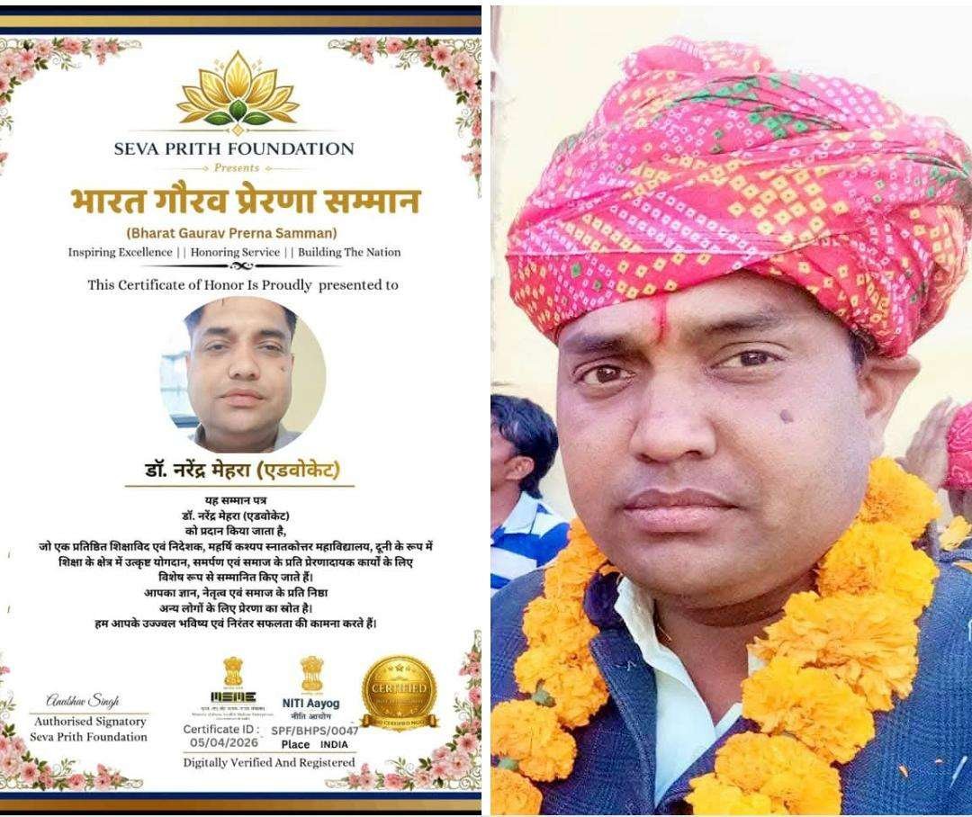 डॉ. नरेंद्र मेहरा के इस सम्मान को शिक्षा जगत में एक महत्वपूर्ण उपलब्धि माना जा रहा है, जिससे क्षेत्र में गौरव और उत्साह का माहौल है।
