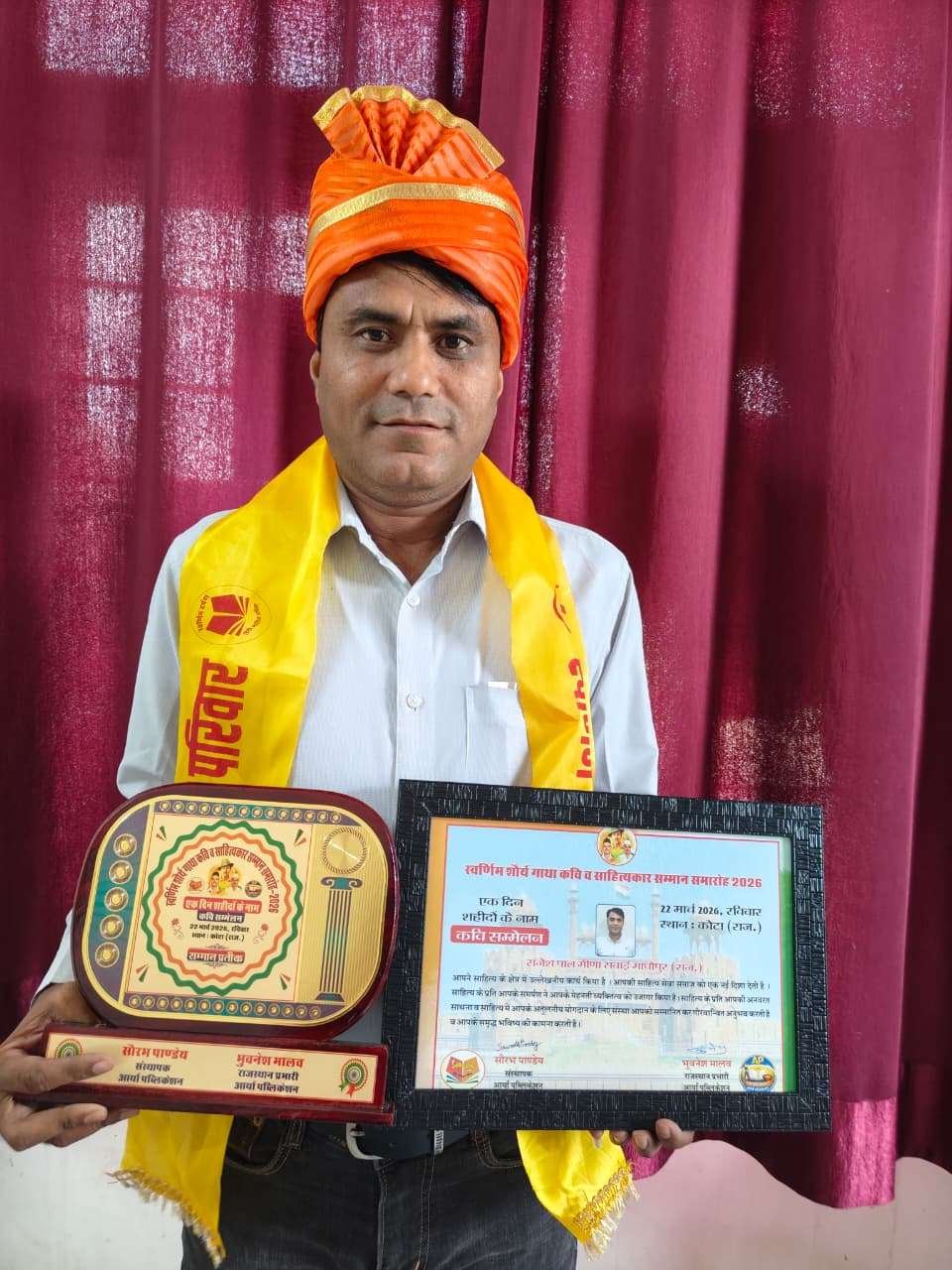 इस अवसर पर राजकीय उच्च प्राथमिक विद्यालय सेदरी में कार्यरत राजेश पाल मीणा को उनके उत्कृष्ट कार्यों के लिए वीरगाथा शौर्य सम्मान 2026 से सम्मानित किया गया। यह सम्मान आर्य पब्लिकेशंस लखनऊ और स्वर्णिम दर्पण पत्रिका के प्रधान संपादक श्री सौरभ पांडेय तथा आर्य पब्लिकेशन के राजस्थान प्रभारी श्री भुवनेश मालव के नेतृत्व में प्रदान किया गया।