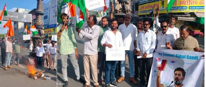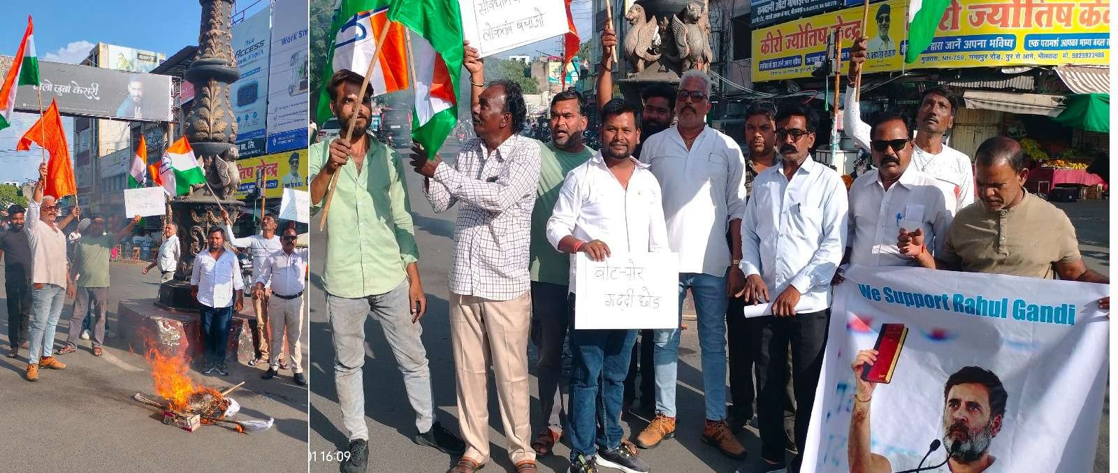 शिवसेना भीलवाड़ा एवं भारतीय कांग्रेस बिग्रेड ने रविवार को सूचना केन्द्र चौराहे पर भाजपा प्रवक्ता पिंटू महादेव का पुतला फूंककर जोरदार विरोध प्रदर्शन किया। प्रदर्शनकारियों ने “देश बचाओ, लोकतंत्र बचाओ, संविधान बचाओ, वोट चोर गद्दी छोड़ो” जैसे नारे लगाए।
