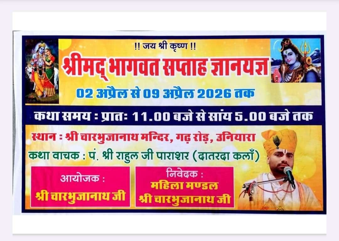 उनियारा (दुर्योधन मयंक) । उनियारा स्थित श्री चारभुजा नाथ मंदिर में कल से श्रीमद भागवत कथा सप्ताह ज्ञानयज्ञ का आयोजन प्रारंभ किया जाएगा।