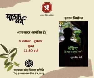 जयपुर। ग्रासरूट मीडिया फाउंडेशन के पाठक पर्व में 5 नवम्बर को किशोर होते हुए बच्चों के जीवन पर विचार विमर्श करने वाली पुस्तक ”भावेश जो कह न सका“ का विमोचन होगा। यह कार्यक्रम झालाना संस्थानिक क्षेत्र स्थित राजस्थान प्रौढ़ शिक्षण समिति के सभागार में होगा।