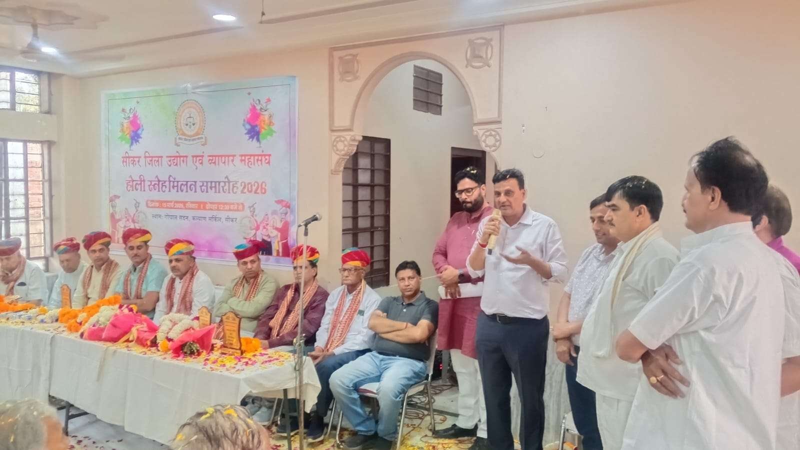 सीकर। जिला उद्योग एवं व्यापार महासंघ, सीकर द्वारा रविवार को कल्याण सर्किल स्थित गोपाल सदन में होली स्नेह मिलन एवं व्यापारी सम्मान समारोह का आयोजन किया गया। समारोह में चंग-बांसुरी की धुन पर लोकगीतों की प्रस्तुतियों और फूलों की होली के साथ व्यापारियों ने उत्साहपूर्वक होली पर्व मनाया।