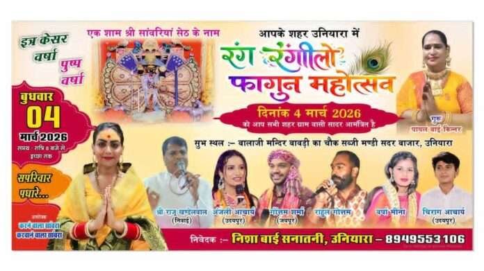 उनियारा (दुर्योधन मयंक)। कस्बे के बावड़ी का चौक स्थित सब्जी मंडी परिसर में बुधवार रात्रि 8 बजे “रंग रंगीलो फागुन महोत्सव” का भव्य आयोजन किया जाएगा।
