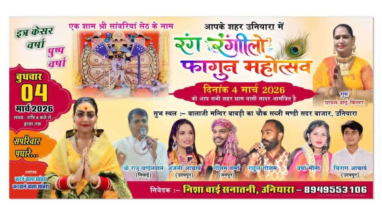 आयोजन समिति की निशा बाई सनातनी ने बताया कि गुरु पायल बाई किन्नर की प्रेरणा से होली के पावन पर्व पर “एक शाम श्री सांवरियां सेठ के नाम” कार्यक्रम के तहत इस विशेष फागुन महोत्सव का आयोजन किया जा रहा है।