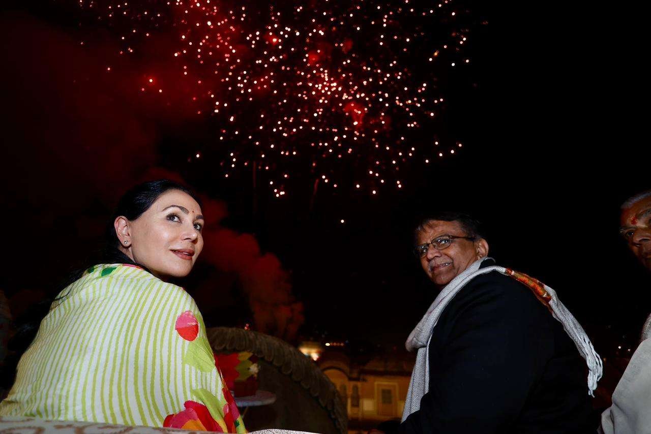 हवामहल की ऐतिहासिक पृष्ठभूमि में गुलाबी शहर का परकोटा रंग-बिरंगी आतिशबाजी की रोशनी में नहा उठा, जिसमें आसमानी फूलझड़ियों, रॉकेट और पटाखों के धमाकों ने वातावरण को रोमांचक बना दिया। हजारों दर्शक आसमान में चमकती रौशनी और लालटेन को निहारते हुए उत्सव का आनंद लिया।