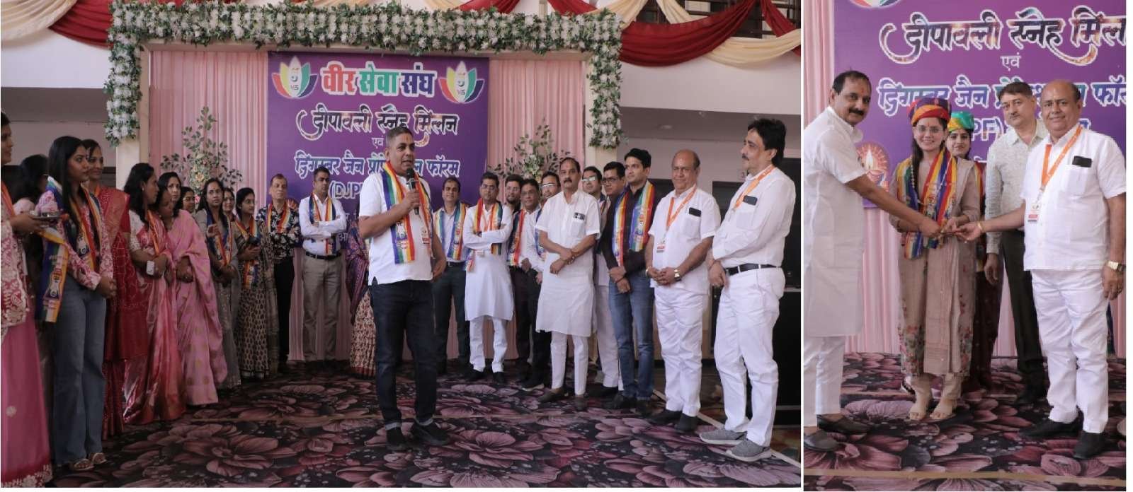 वीर सेवा संघ, भीलवाड़ा द्वारा दीपावली स्नेह मिलन समारोह का आयोजन विद्यासागर वाटिका में उत्साहपूर्वक किया गया। कार्यक्रम की शुरुआत वीर सेवा संघ के चेयरमैन सुभाष हुमड, संरक्षक एन.सी. जैन, सनत अजमेरा, अजय झांझरी, प्रवीण चौधरी, सुरेश कोठारी, वाइस चेयरमैन नरेश गोधा, राजकुमार सेठी और मुकेश पटौदी द्वारा दीप प्रज्वलन के साथ हुई।