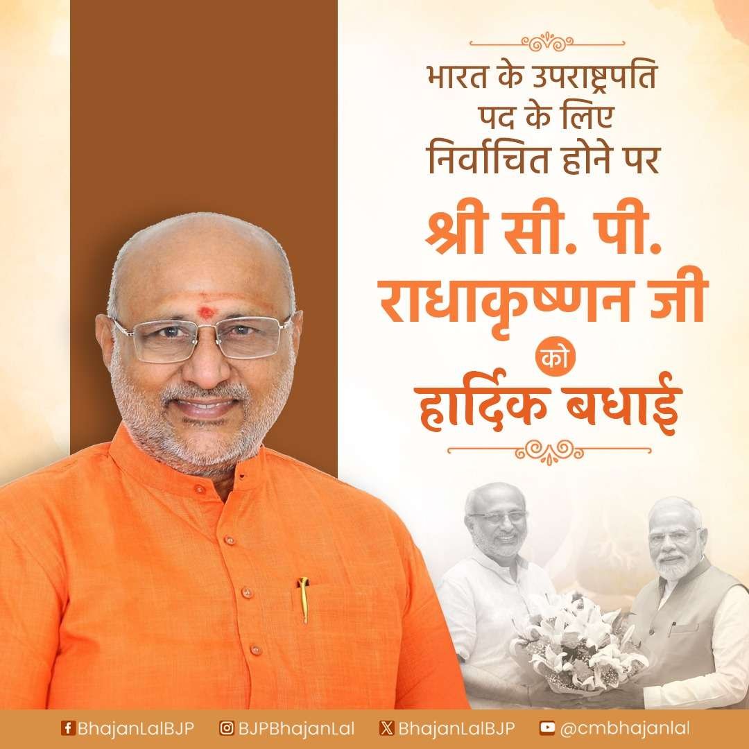 जयपुर । मुख्यमंत्री भजनलाल शर्मा ने मंगलवार को उपराष्ट्रपति पद के चुनाव में विजयी सी.पी. राधाकृष्णन को बधाई और शुभकामनाएं दी हैं।