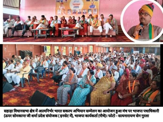 गुरला (सत्यनारायण सेन गुरला): सहाड़ा विधानसभा क्षेत्र में भारतीय जनता पार्टी (भा.ज.पा.) द्वारा आयोजित आत्मनिर्भर भारत संकल्प अभियान में कार्यकर्ताओं से स्वदेशी वस्तुओं को अपनाने का आह्वान किया गया। यह कार्यक्रम विनायक विधापिठ स्कूल भुणास सभागार में सहाड़ा-रायपुर-हमीरगढ़ विधानसभा स्तरीय आयोजित किया गया।