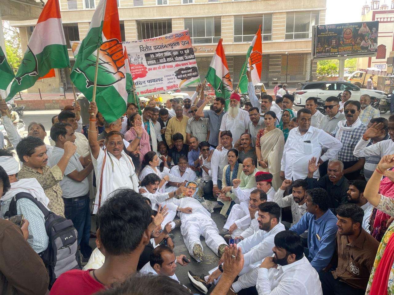 अजमेर। राजस्थान की सियासत में जुबानी जंग अब सड़कों पर संग्राम का रूप ले चुकी है। भाजपा के प्रदेश प्रभारी राधामोहन दास अग्रवाल द्वारा पूर्व उपमुख्यमंत्री सचिन पायलट पर की गई ‘विवादित टिप्पणी’ ने कांग्रेस कार्यकर्ताओं के सब्र का बांध तोड़ दिया है। इसी के विरोध में आज अजमेर का गांधी भवन चौराहा नारों और विरोध के धुएं से भर गया।
