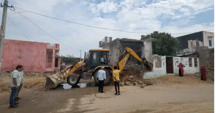 ग्राम लाडपुरा में NH-59 सड़क चौड़ाईकरण परियोजना के तहत लोक निर्माण विभाग (PWD) और ग्राम पंचायत ने संयुक्त कार्रवाई करते हुए अतिक्रमण हटाया। इस दौरान पुलिस प्रशासन की मौजूदगी में जेसीबी की सहायता से सड़क पर बने मकान को तोड़ा गया।