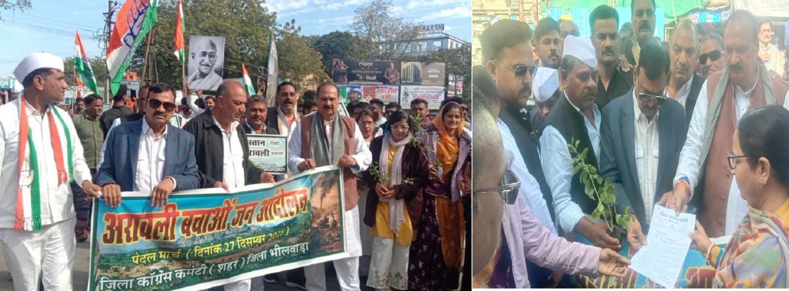 भीलवाड़ा। (पंकज पोरवाल) अरावली पर्वतमाला के संरक्षण एवं महात्मा गांधी नरेगा योजना को कमजोर या निरस्त किए जाने के प्रयासों के विरोध में आज जिला कांग्रेस कमेटी, भीलवाड़ा शहर के नेतृत्व में एक जोरदार जन-जागरण रैली आयोजित की गई। रैली के बाद सिटी कंट्रोल रूम के बाहर राष्ट्रपति के नाम ज्ञापन सौंपा गया, जिसे भीलवाड़ा की तहसीलदार नीरज रावत ने प्राप्त किया।