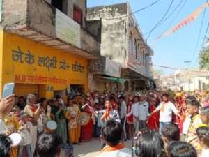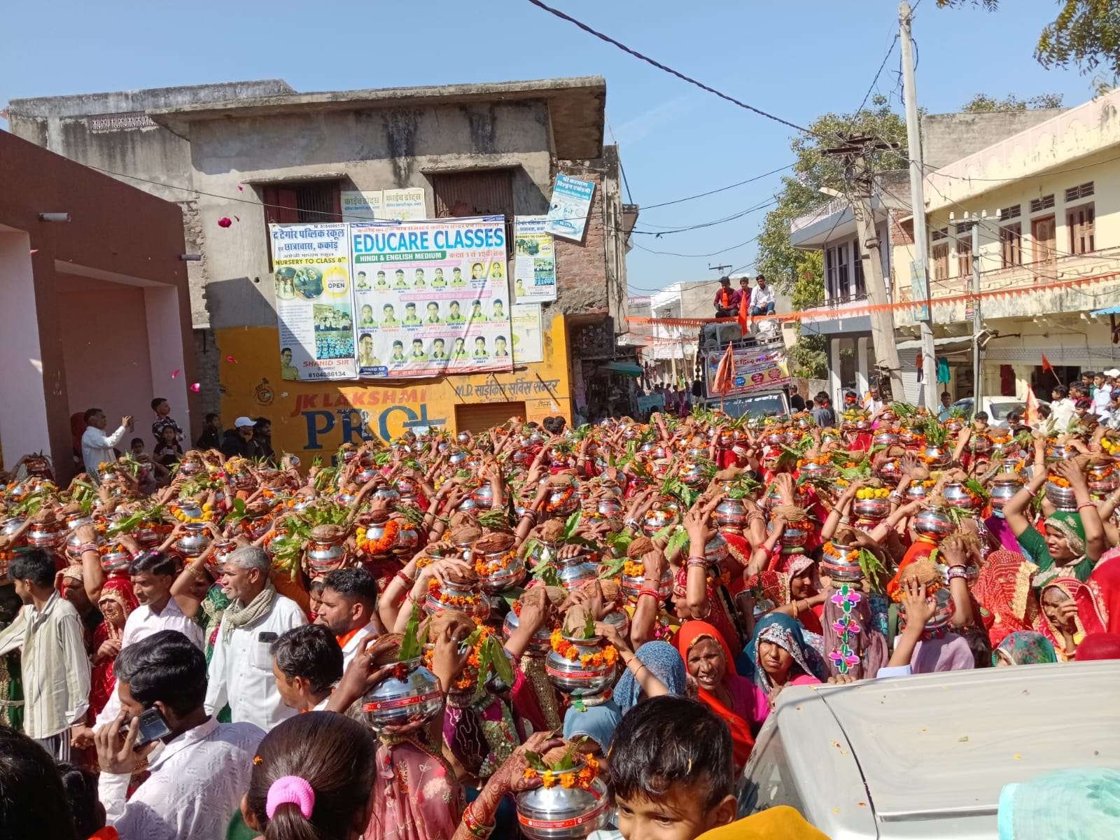 सैकड़ों महिलाएं सिर पर कलश धारण कर यात्रा में शामिल हुईं, वहीं युवा कलाकार शौर्यपूर्ण करतब दिखाते हुए आगे बढ़ रहे थे। तीनों कलश यात्राओं का संगम श्री चारभुजा नाथ मंदिर के समीप हुआ, जहां 501 महिलाओं ने एक साथ कलश धारण किया और युवक जयकारे लगाते हुए करतब दिखाते हुए चल रहे थे। शोभायात्रा में राम-लक्ष्मण-सीता-हनुमान की सजीव झांकी भी शामिल थी। रास्ते में पुष्पवर्षा और रंगोली से भव्य स्वागत किया गया।