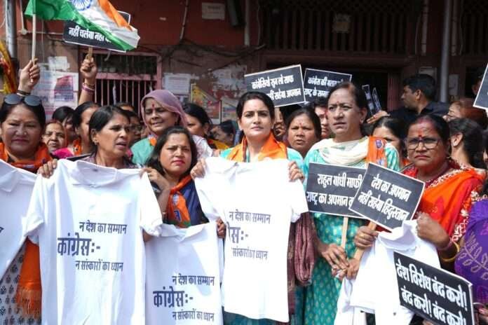 जयपुर(रूपनारायण सांवरिया)। नई दिल्ली में एआई समिट के दौरान यूथ कांग्रेस द्वारा किए गए अशोभनीय एवं अर्धनग्न प्रदर्शन के विरोध में भाजपा महिला मोर्चा, राजस्थान की प्रदेश अध्यक्ष राखी राठौड़ के नेतृत्व में चाँद पोल बाजार में सड़क पर उतरकर विरोध प्रदर्शन किया।