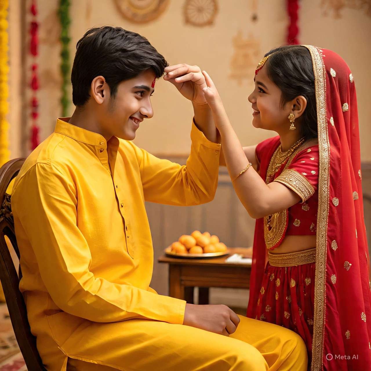 बहनें भाई के माथे पर चंदन, रोली, अक्षत और दूब से तिलक करती हैं। फिर आरती उतारती हैं और मिठाई खिलाती हैं।