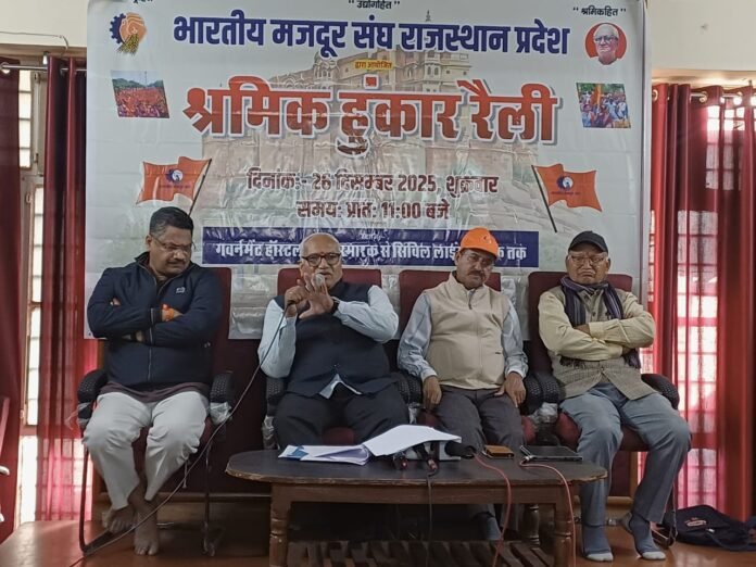 जयपुर| भारतीय मजदूर संघ, राजस्थान प्रदेश के आह्वान पर शुक्रवार, 26 दिसंबर 2025 को जयपुर में “श्रमिक हुंकार रैली” का आयोजन किया जायेगा। यह रैली प्रातः 11 बजे शहीद स्मारक से प्रारंभ होकर सिविल लाइंस फाटक तक पहुँचेगी, जिसमें प्रदेशभर से हजारों श्रमिकों, कर्मचारियों द्वारा भाग लिया जायेगा।