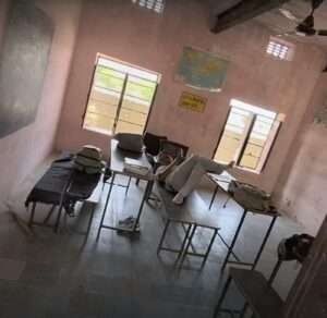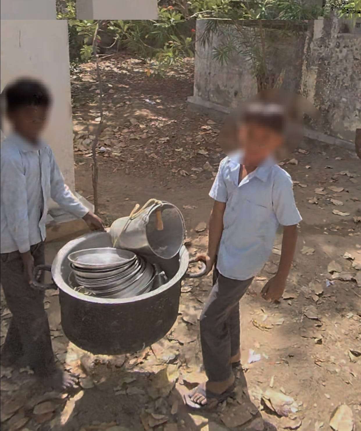 स्कूल के कक्षा कक्ष के भीतर 4 शिक्षक आराम फरमाते हुए सोते नजर आए, जबकि दूसरी ओर छोटे-छोटे बच्चे भारी स्टील के बर्तन उठाकर इधर-उधर ले जाते दिखे।