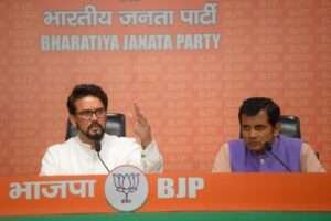 भाजपा सांसद और पूर्व केंद्रीय मंत्री अनुराग सिंह ठाकुर ने गुरुवार को नई दिल्ली स्थित भाजपा मुख्यालय में प्रेस वार्ता कर राहुल गांधी और कांग्रेस पर तीखा हमला बोला। उन्होंने कहा कि राहुल गांधी बार-बार झूठे आरोप लगाते हैं और जब सबूत देने की बारी आती है तो पीछे हट जाते हैं।