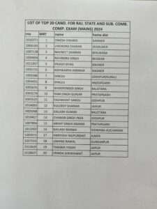 राजस्थान लोक सेवा आयोग के अनुसार प्रदेश में पहले स्थान पर दिनेश बिश्नोई बाड़मेर, दूसरे वीरेंद्र चारण जैसलमेर ,तीसरे नवनीत शर्मा भीलवाड़ा ,चौथे रविंद्र सिंह ब्यावर ,पांचवा विकास ब्यावर ,छठे स्थान पर ऐश्वर्या कंवर बीकानेर, सातवें स्थान पर दिनेश जोधपुर ग्रामीण, आठवें स्थान पर शालू अनूपगढ़, नवमी स्थान पर भूपेंद्र सिंह बालोतरा ,दसवीं स्थान पर राम सिंह गुर्जर रहे, 11वें स्थान पर यशवंत संधू जोधपुर, 12 वे स्थान पर कुलदीप शर्मा जयपुर, 13 में स्थान पर कैलाश कुमार बालोतरा, 14 स्थान पर चंदन सिंह जोधपुर, 15 स्थान पर अभय सिंह आंजना प्रतापगढ़, 16 स्थान पर कैलाश डीडवाना कुचामन, 17वे में स्थान पर हरि यश राजपुरोहित, अजमेर 18 स्थान पर उमंग रावल डूंगरपुर, 19 में स्थान पर तनीषा यादव जयपुर और 20 वे में स्थान पर वृंदा शेखावत जयपुर रही।