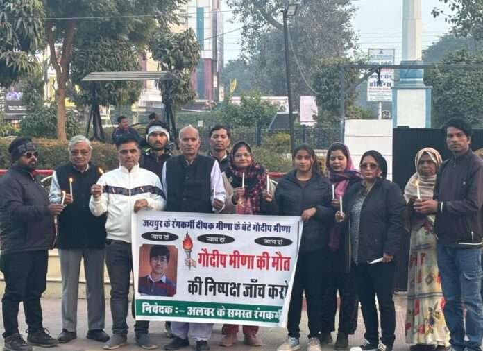 अलवर। जयपुर के प्रसिद्ध रंग कर्मी दीपक मीणा के पुत्र गोदीप मीणा की मृत्यु दिनांक 22 दिसंबर 2025 को संदिग्ध अवस्था में जयपुर के होटल में हुई! मृत्यु की निष्पक्ष जांच कराने के लिए  अलवर  में रंग कर्मियों का एक कैंडल मार्च शाम को नंगली सर्किल से शहीद स्मारक कंपनी बाग तक निकाल कर श्रद्धांजलि दी गई और निष्पक्ष जांच के लिए प्रशासन से अनुरोध किया गया।