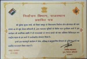 जयपुर। विशेष गहन पुनरीक्षण कार्यक्रम के तहत परिगणना प्रपत्रों के डिजिटाइजेशन कार्य में उत्कृष्ट प्रदर्शन करने वाले जुझारू, समर्पित एवं प्रेरक 95 बूथ लेवल अधिकारियों (बीएलओ) को जिला निर्वाचन अधिकारी डॉ. जितेन्द्र कुमार सोनी ने प्रशस्ति पत्र प्रदान कर सम्मानित किया।