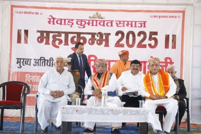 चित्तौड़गढ़ – मेवाड़ कुमावत समाज की ओर से रविवार को गोवर्धन रंगमंच, मंडफिया में मेवाड़ कुमावत महाकुंभ-2025 का आयोजन किया गया। इस कार्यक्रम में राज्यपाल हरिभाऊ बागड़े बतौर मुख्य अतिथि शामिल हुए। समारोह की अध्यक्षता पशुपालन, गोपालन, डेयरी एवं देवस्थान विभाग के कैबिनेट मंत्री जोराराम कुमावत ने की, जबकि विशिष्ट अतिथि आसींद के पूर्व विधायक नानूराम कुमावत रहे।