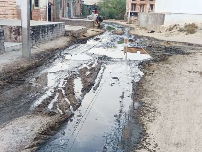 रियांबड़ी। उपखंड क्षेत्र के ग्राम पंचायत लांपोलाई में कंवरियाट रोड की स्थिति इतनी खराब हो गई है कि गुजरना मुश्किल और खतरनाक हो गया है। सड़क पर जमा कीचड़ और गहरे गड्ढों के कारण न केवल लोग, बल्कि मवेशी भी इस मार्ग से निकलने में परेशान हैं।
