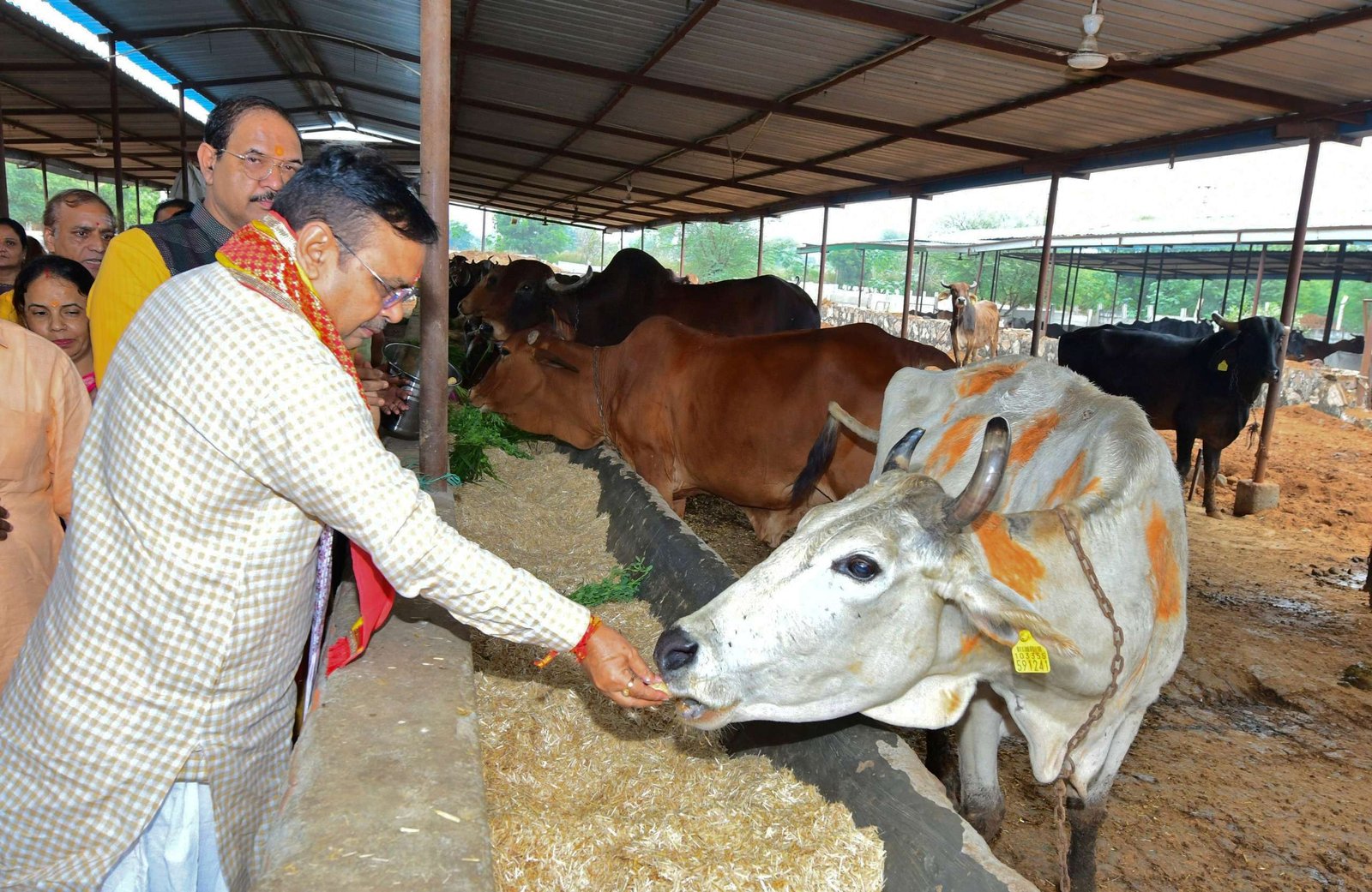 मुख्यमंत्री शर्मा ने अपनी पत्नी के साथ सद्गुरू टेऊँराम गोशाला में गौ माता की पूजा-अर्चना कर तिलक लगाया और गुड़ खिलाया।