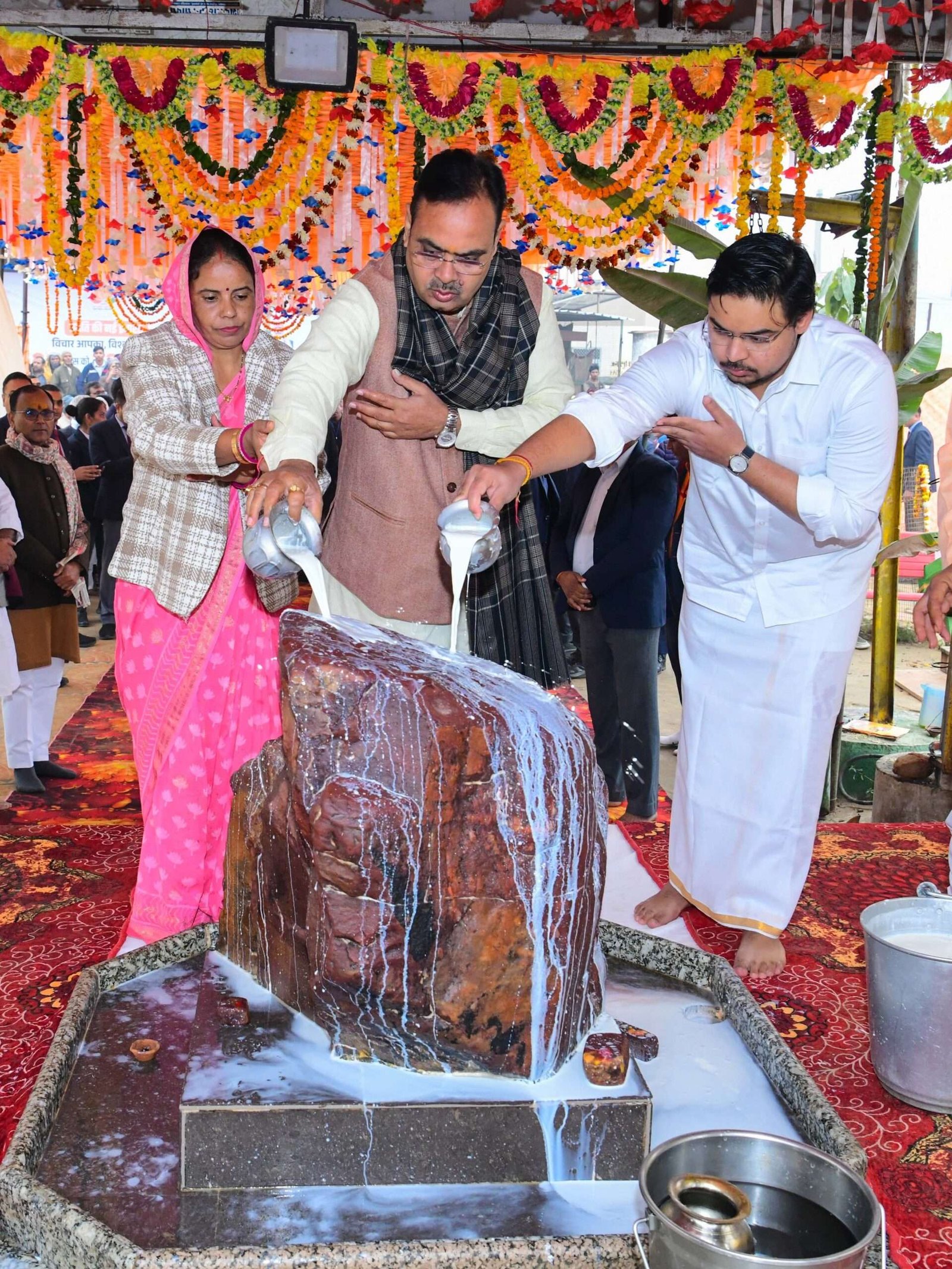 शर्मा ने सपरिवार श्रीनाथ जी महाराज का पंचामृत अभिषेक किया, जिसमें दूध, दही, घी, शहद और शक्कर का उपयोग किया गया। इससे पहले मंत्रोच्चार के साथ संपन्न हुए अनुष्ठान में उन्होंने श्रीनाथ जी के मुकुट और मुखारबिंद का विशेष श्रृंगार एवं पूजन किया। इस अवसर पर उन्होंने जतिपुरा पर संत-साधुओं को भोजन और प्रसादी भी ग्रहण करवाई।
