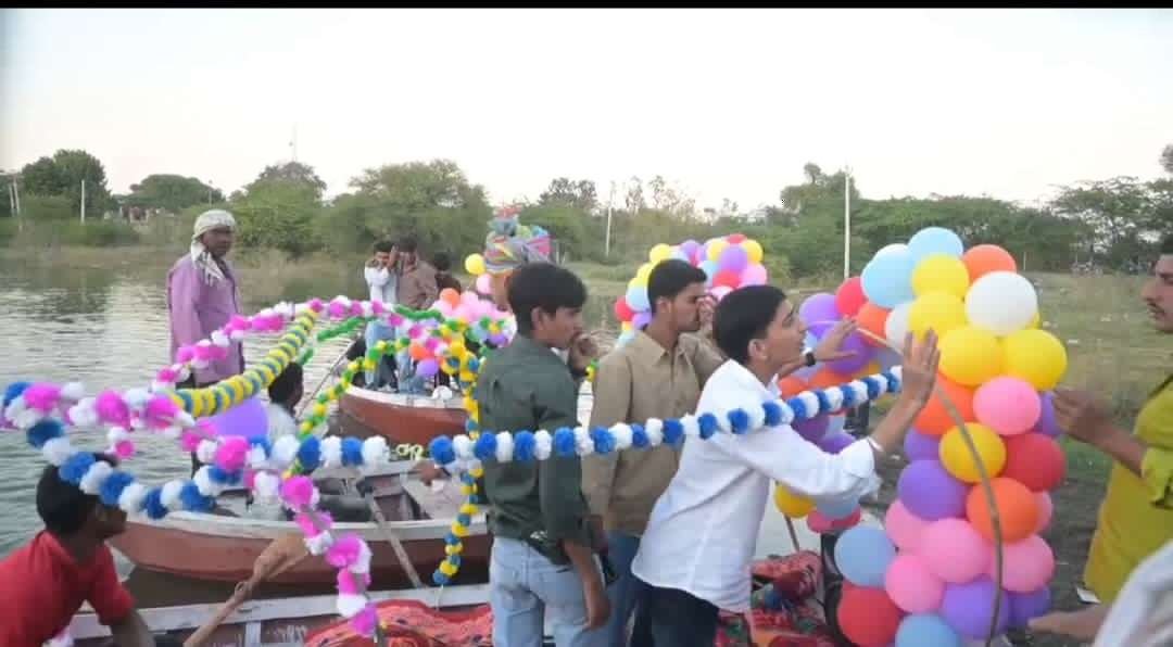 इसके तहत लाखोला गांव के तालाब में आधा दर्जन से अधिक नावों को रंग-बिरंगे गुब्बारों से सजाया गया। ढोल-नगाड़ों की गूंज के साथ बाराती नाचते-गाते तालाब पहुंचे और दूल्हे सहित सभी बाराती तैरती नावों में सवार होकर फोटो सेशन करते हुए बघेरा गांव की ओर रवाना हुए। तालाब में नावों से जाती बारात का दृश्य बेहद आकर्षक और अनोखा रहा।