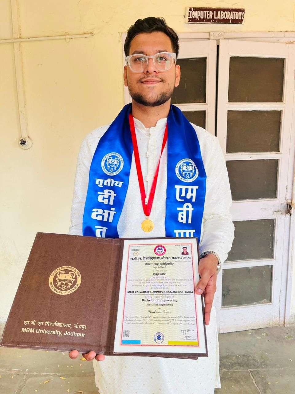 श्री महर्षि जनार्दन गिरि पुष्टिकर माध्यमिक विद्यालय के पूर्व छात्र मुकुंद व्यास को सत्र 2024-25 में इलेक्ट्रिकल इंजीनियरिंग में 9.49 सीजीपीए के साथ उत्तीर्ण होने पर 19 मार्च को जोधपुर में आयोजित दीक्षांत समारोह में हरिभाऊ किसनराव बागड़े द्वारा स्वर्ण पदक एवं उपाधि प्रदान की गई।