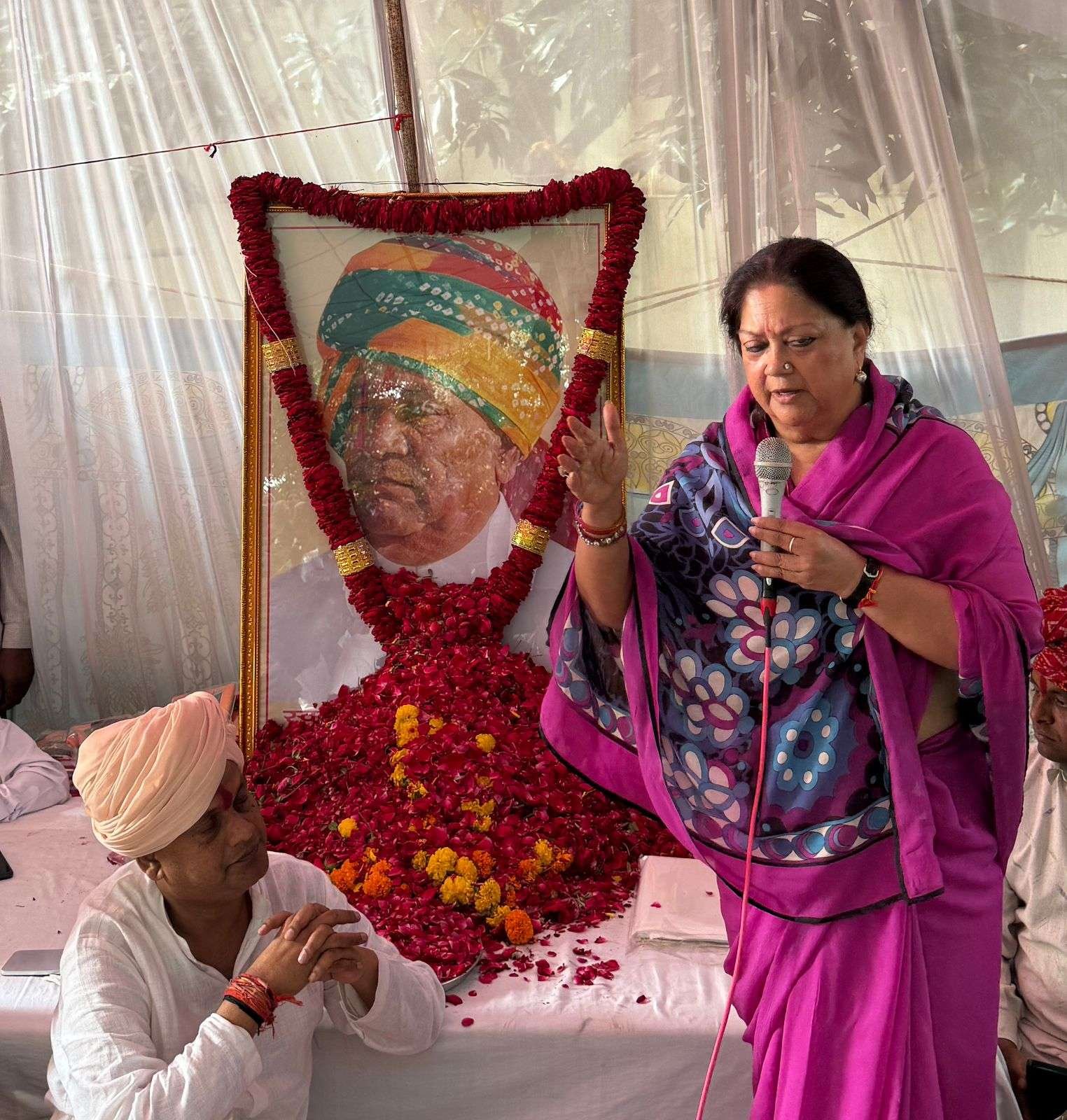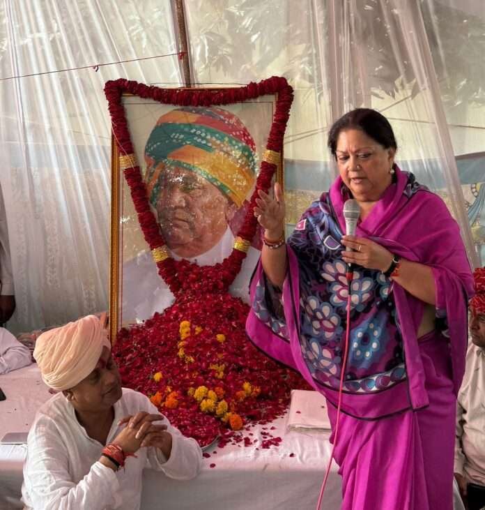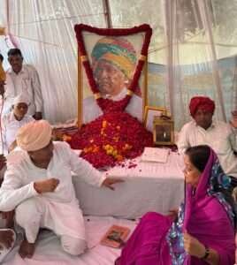 जयपुर।पूर्व मुख्यमंत्री वसुन्धरा राजे पूर्व मंत्री नंद लाल मीणा के गांव अम्बा माता (प्रतापगढ़) पहुची और पगड़ी के दस्तूर में शामिल हुई।उन्होंने स्व.मीणा के चित्र पर श्रद्धा सुमन अर्पित किए।साथ ही राजस्व मंत्री हेमंत मीणा को ढाढ़स बँधाया।