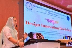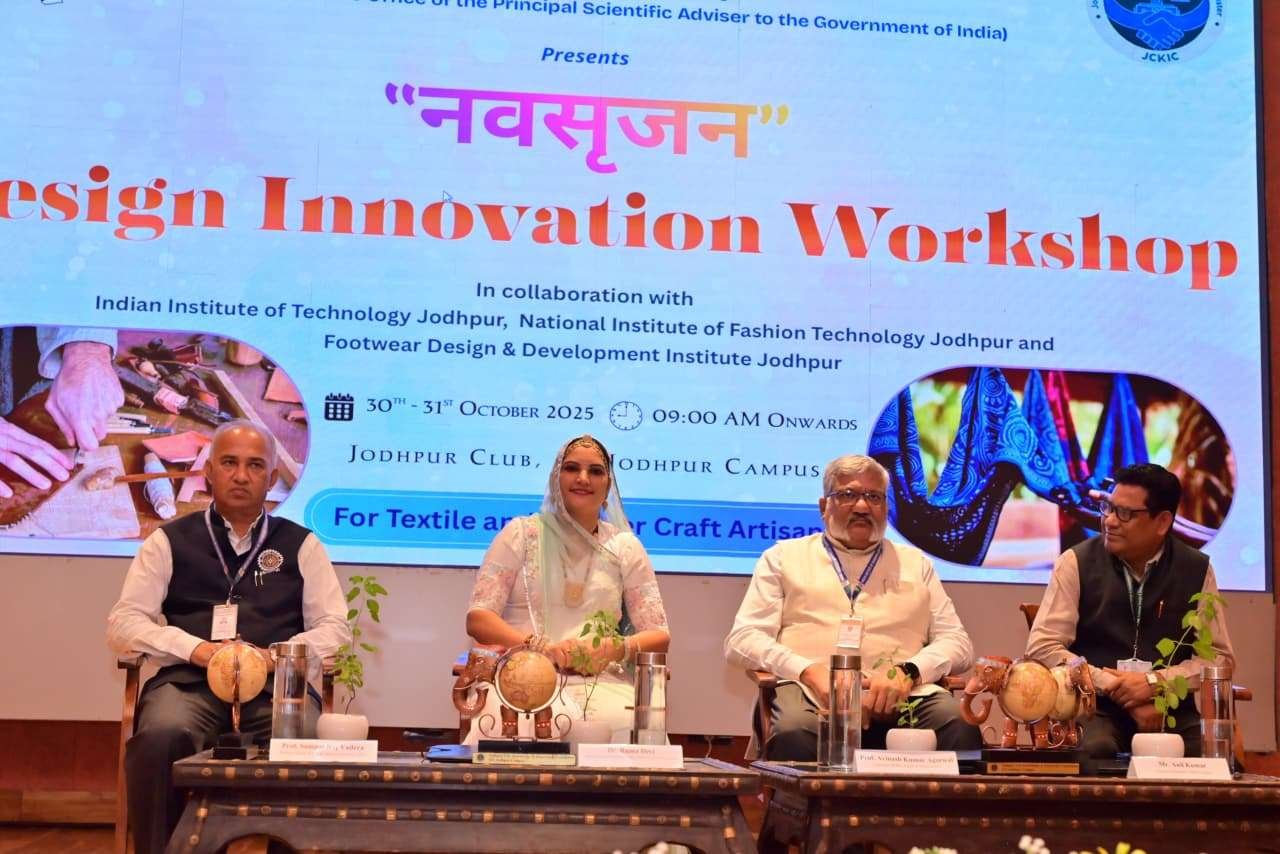 जोधपुर। आईआईटी जोधपुर कैंपस में जोधपुर सिटी नॉलेज एंड इनोवेशन फाउंडेशन (JCKIF), निफ्ट और एफडीडीआई के संयुक्त तत्वावधान में आयोजित नवसृजन डिजाइन इनोवेशन कार्यशाला में अंतरराष्ट्रीय फैशन डिजाइनर और सामाजिक कार्यकर्ता डॉ. रूमा देवी ने कहा कि “परम्परागत शिल्प कलाओं को वैश्विक बाजार दिलाने के लिए तकनीक का समावेश आवश्यक है।”