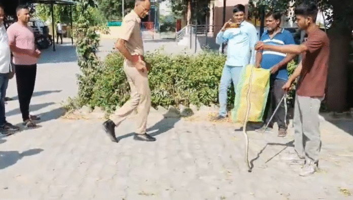 जानकारी के अनुसार, थाना परिसर में धामण प्रजाति का सांप आ गया था। पुलिस की सूचना पर सर्प मित्र हर्षित जाग्रत मौके पर पहुंचे और सांप को सुरक्षित रेस्क्यू कर जंगल में छोड़ दिया।